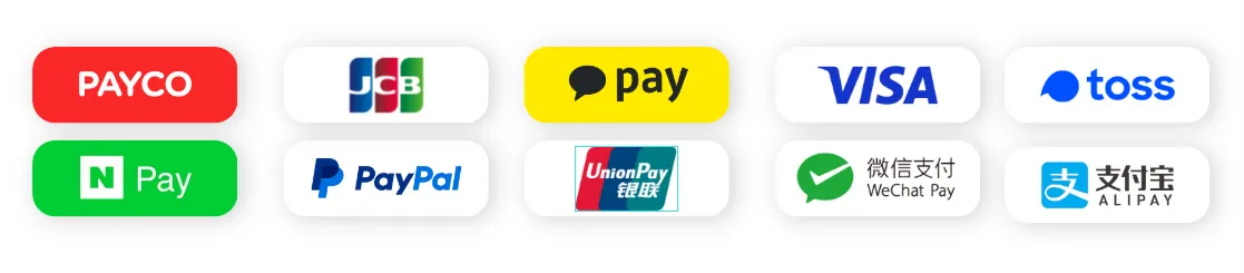 신용카드와 무통장 입금은 물론, 토스 페이, 카카오 페이, 네이버 페이, 페이팔 등 다양한 결제 방식을 제공하고 있습니다. 후불 정산 방식도 가능해요!