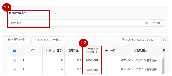 オプション商品の場合は、オプションごとに "販売者オプションコード" を入力します。