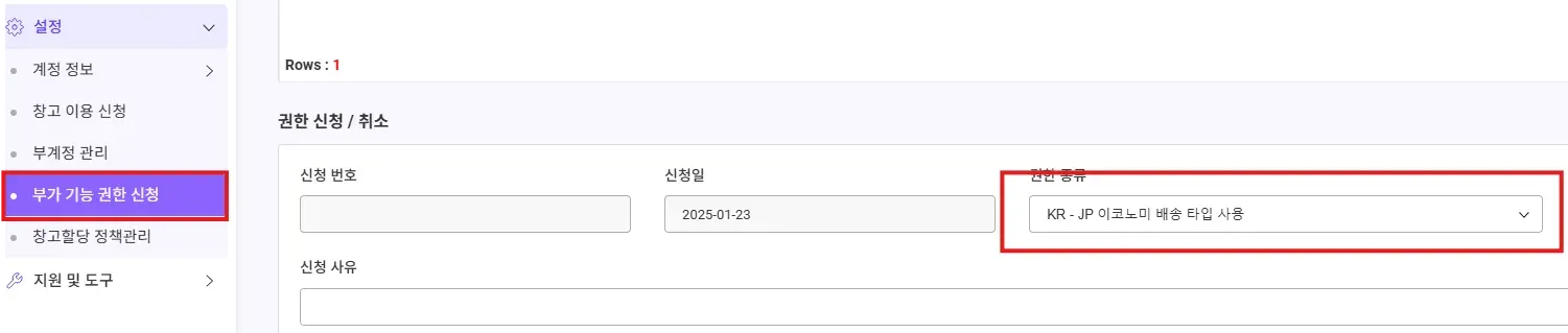 스마트십 > 설정 > 부가 기능 권한 신청 > 권한종류 [ KR - JP 이코노미 배송 타입 사용 ] 선택 > 권한 신청