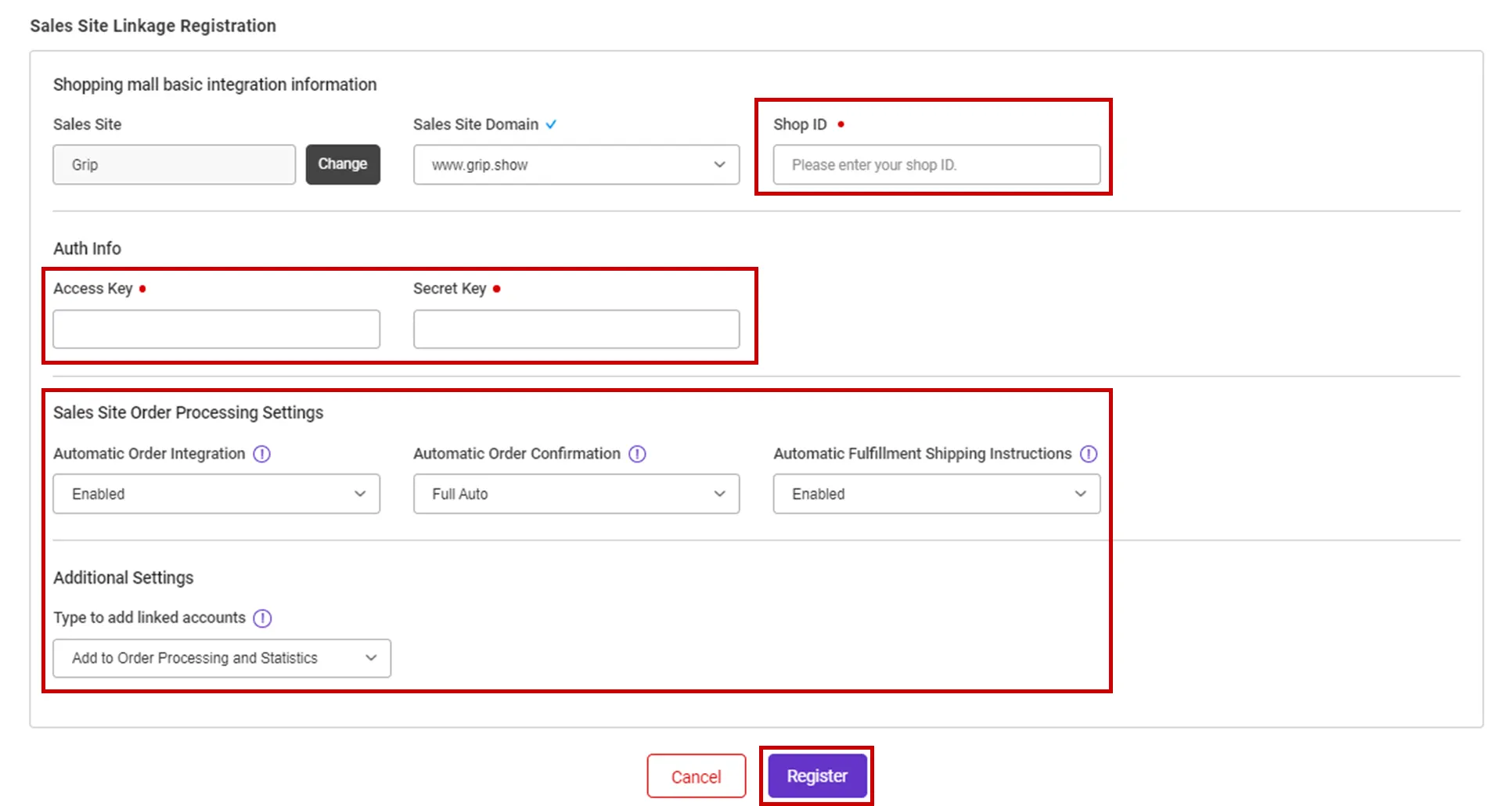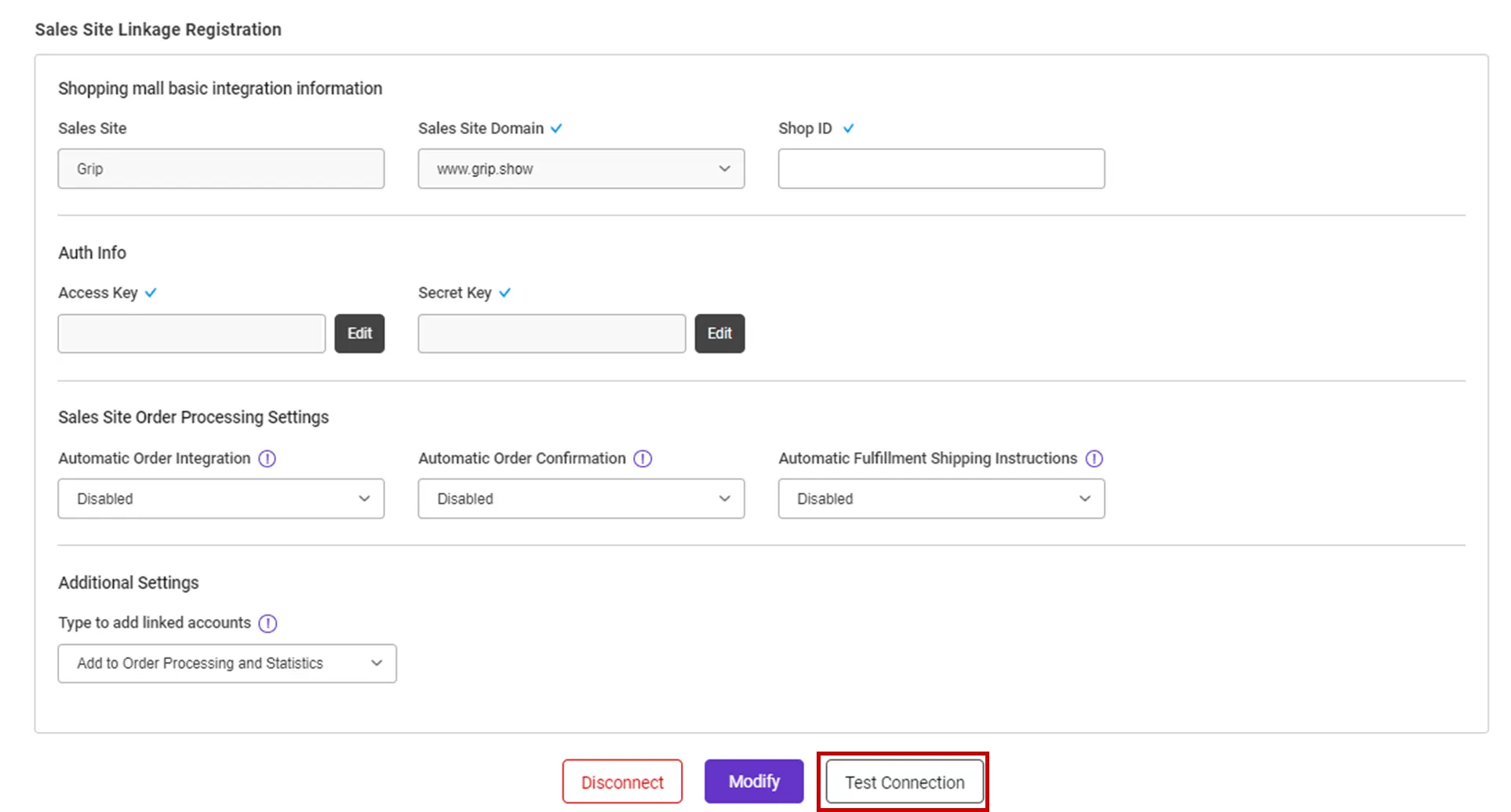 Access Key : Enter the Access Key issued by 1. Get API KEY from Grip Business Center.
