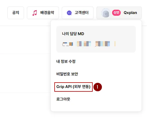 Lig in to the Grip Business Center, click on the seller login ID part at the top right, and enter the 'Grip API(External connection)' in the menu unfolded at the bottom.