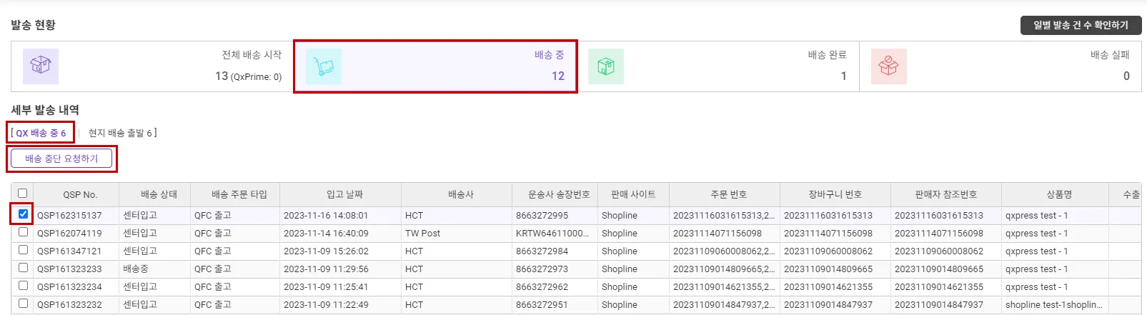 [배송] > [배송 중] > 주문건 선택 > [배송 중단 요청하기]