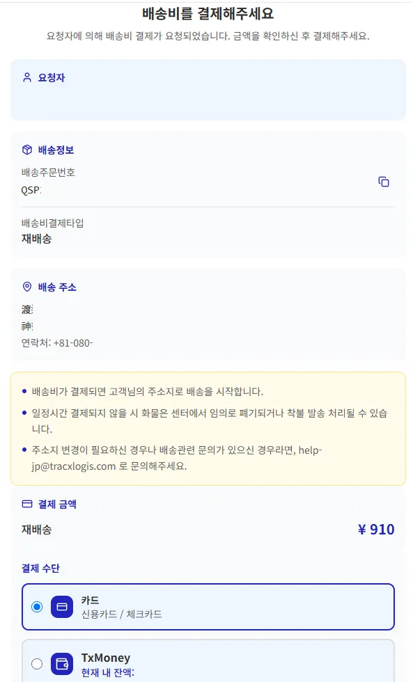 [TracxLogis] 渡邉葵様, TracXLogis Japanです。 送り状番号:패킹번호 商品名:[상품명]... 再配送の費用は下記のリンクからご確認お願いします。[https://txl.show/단축 링크] お問合せ先 https://tracxlogis.channel.io/home