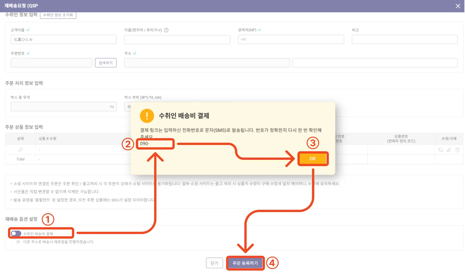 재배송 배송비를 수취인 부담으로 진행은 아래와 같은 방식으로 진행되고 있습니다.