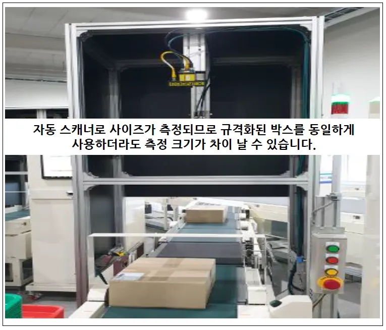 자동 스캐너(레이저 측정)로 사이즈를 측정하고 있어서 동일 사이즈의 박스이더라도 측정된 사이즈는 다를 수 있습니다.