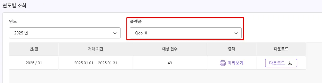 조회 필터에서 플랫폼을 “Qoo10”으로 선택하시면 QSM에서 발송 처리한 내역의 자료를 조회할 수 있습니다.