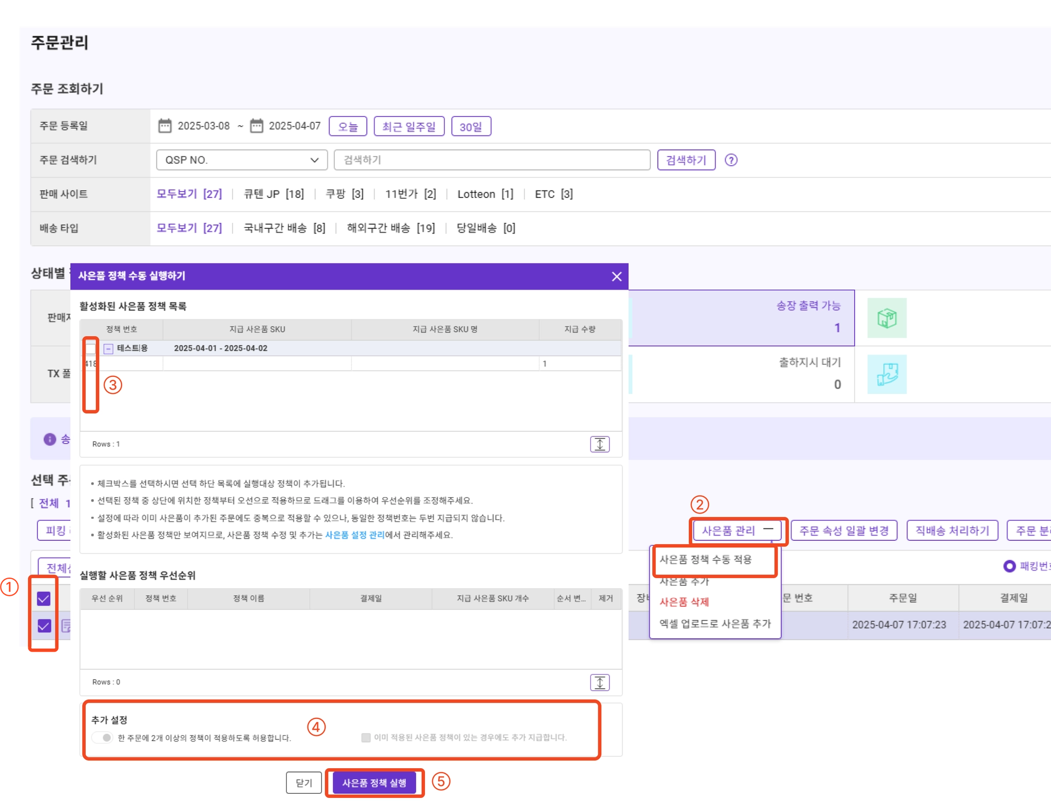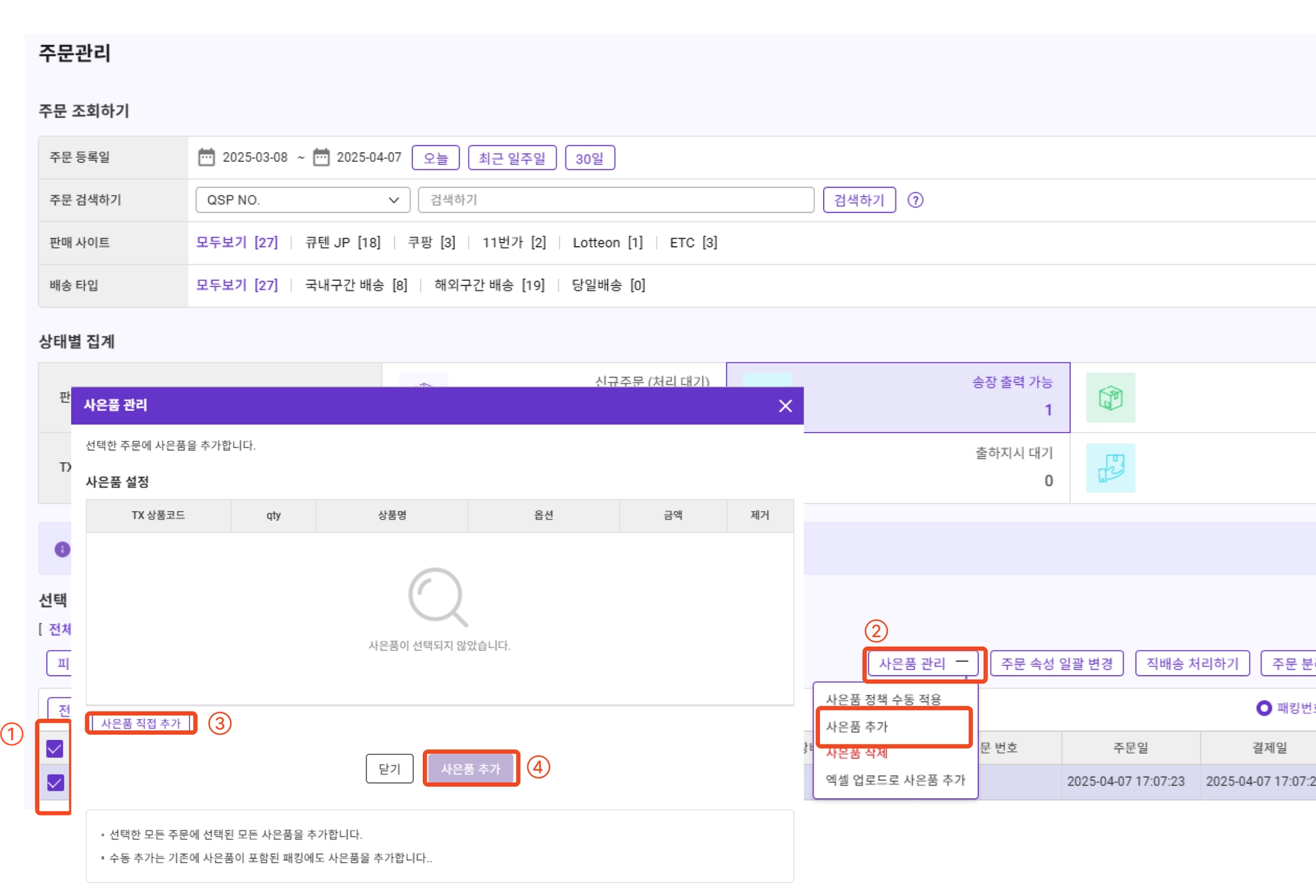 사은품 정책 없이 원하는 주문건에 사은품 추가 방법