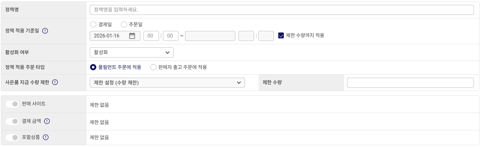 사은품 적용 설정 및 세부 정책 설정을 통하여 사은품을 추가할 수 있습니다.