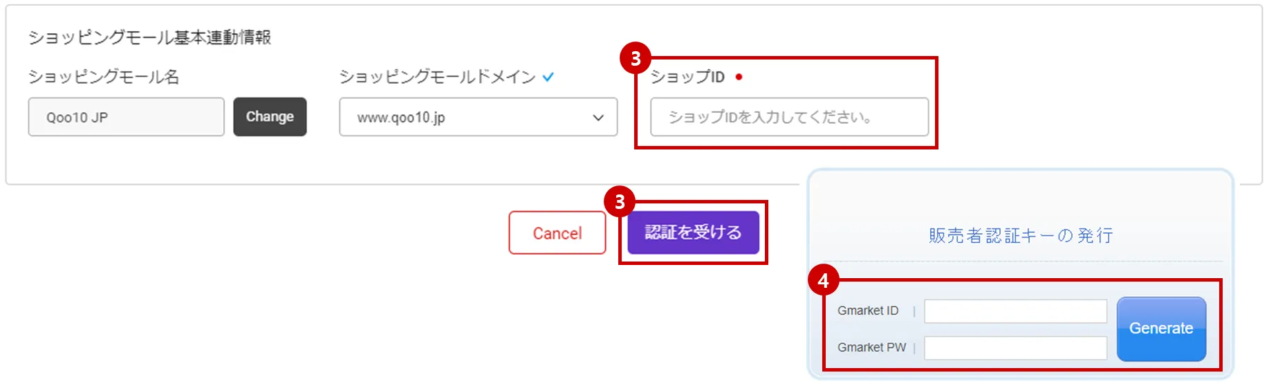 ショップID: Qoo10 販売者IDを記載の上、[認証を受ける] ボタンを押してください。