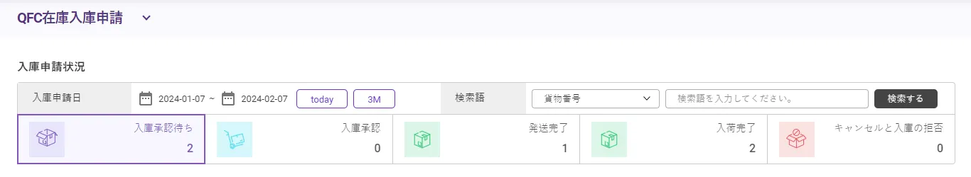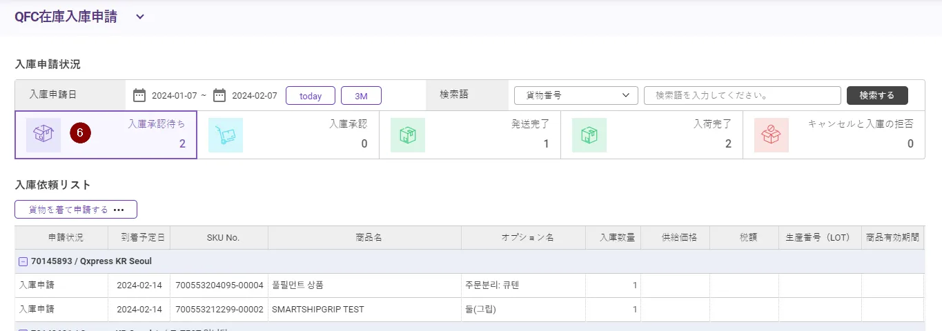 入庫承認待ち: 入庫申請が完了したら、QFC担当者の承認をお待ちください。 販売者様が入力したSKUの数量やサイズなどによって保管面積を点検した後、承認または拒否が行われます。