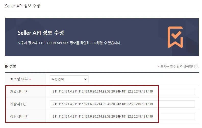 スマートシップサービスの円滑な運営のため、新規サーバーIPが追加されます。該当サーバーIPをIPホワイトリストに追加していただく必要があります。連携エラーや認証失敗が発生した場合、以下のIPアドレスを11Street販売者センターのAPIキー設定で追加してください。