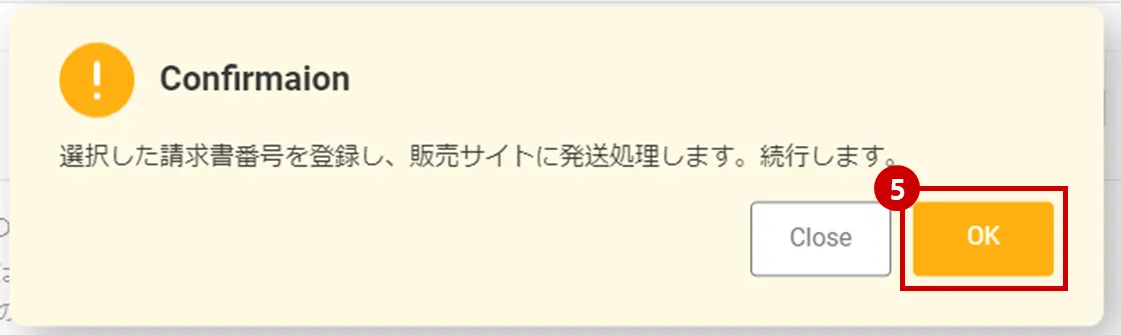 [OK]ボタンを押すと、ショッピングモールの注文に入力した配送会社と請求書番号が登録され、発送処理状態に変更されます。