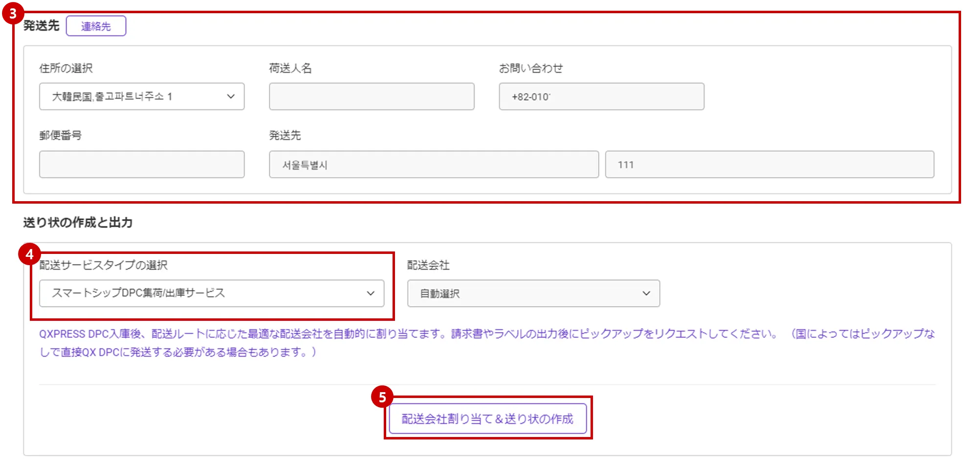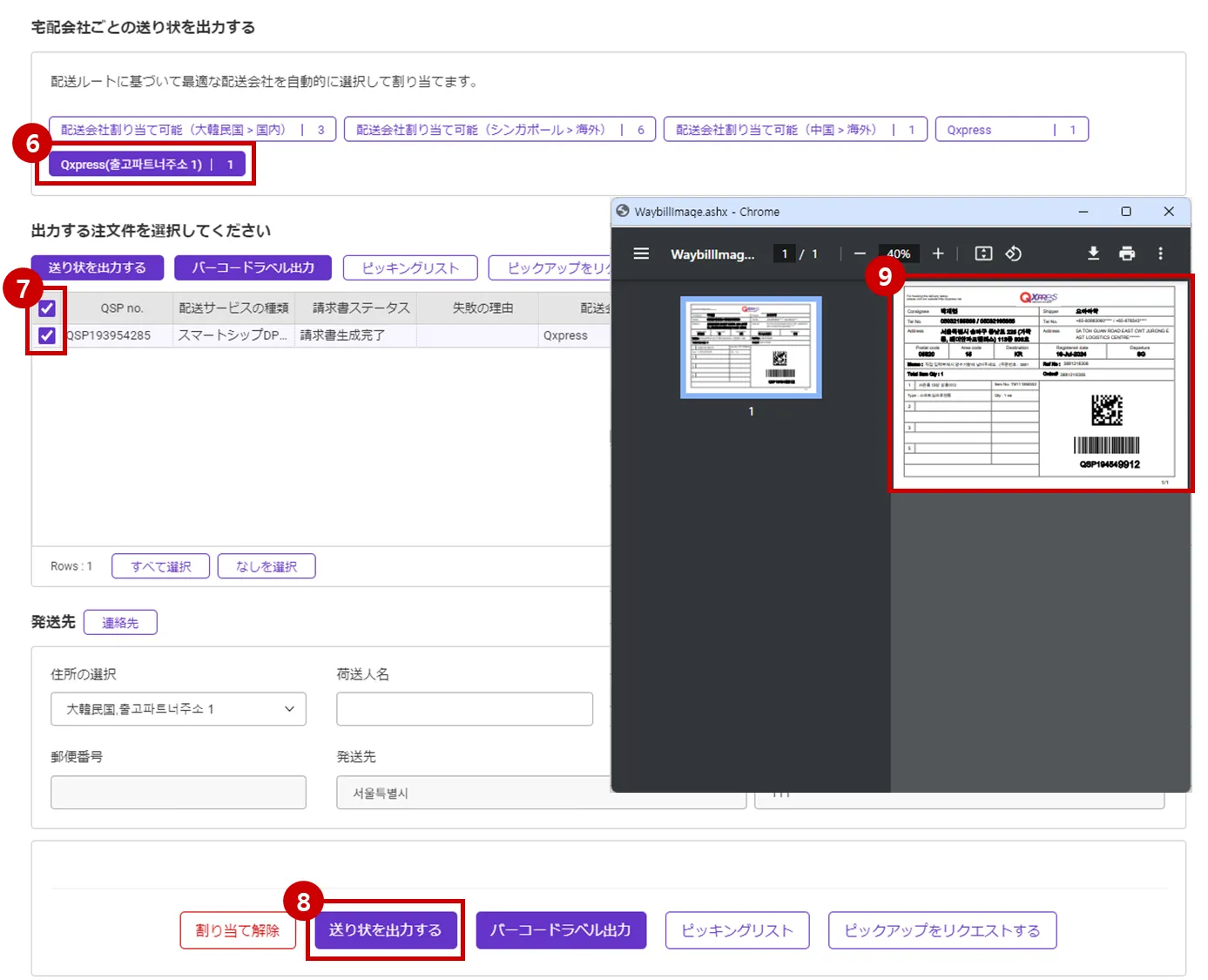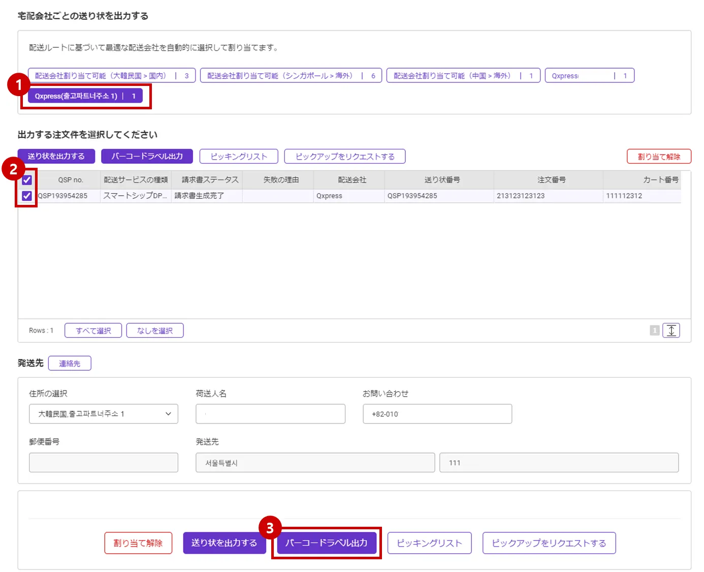 (QXPRESSが基本の配送会社として割り当てられ、既存のQSP番号が請求書番号として指定されます。)