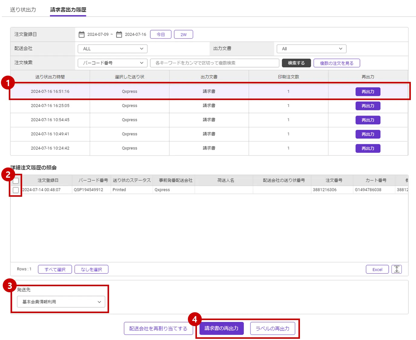 請求書出力履歴から請求書の再出力が必要な注文を選択します。