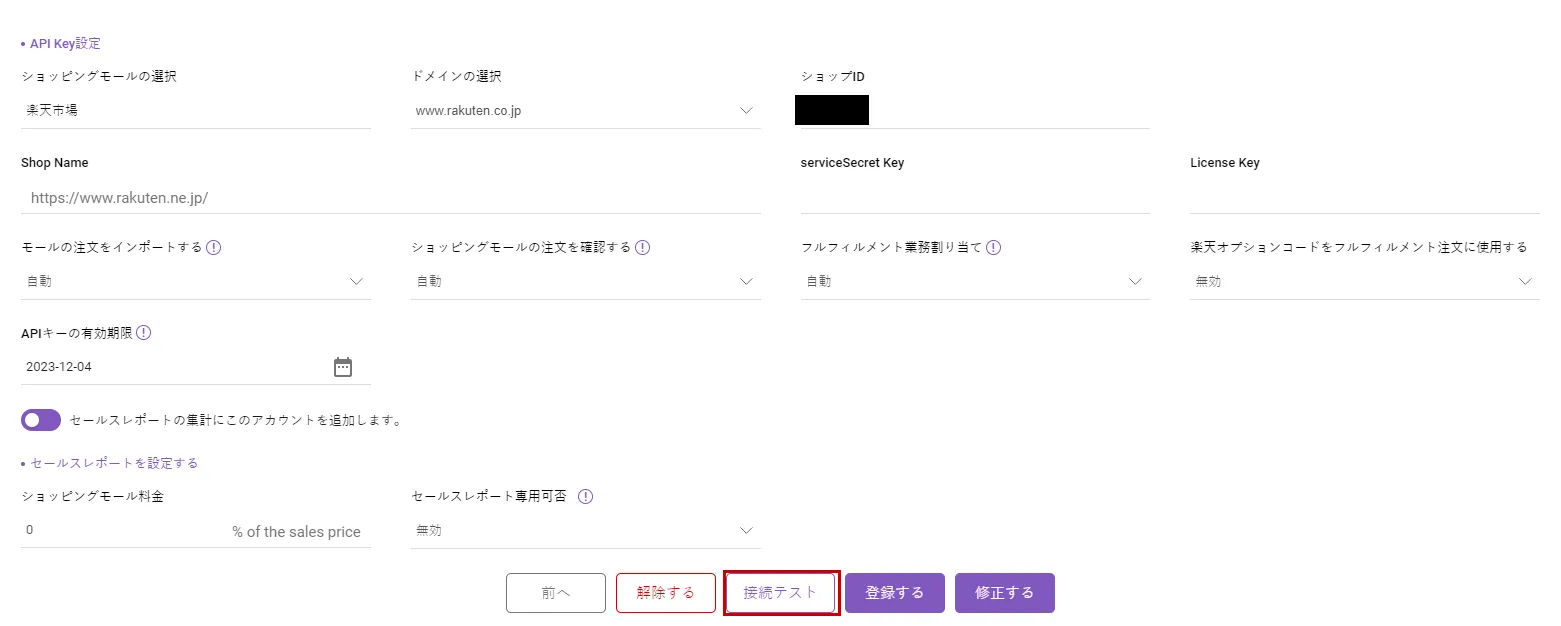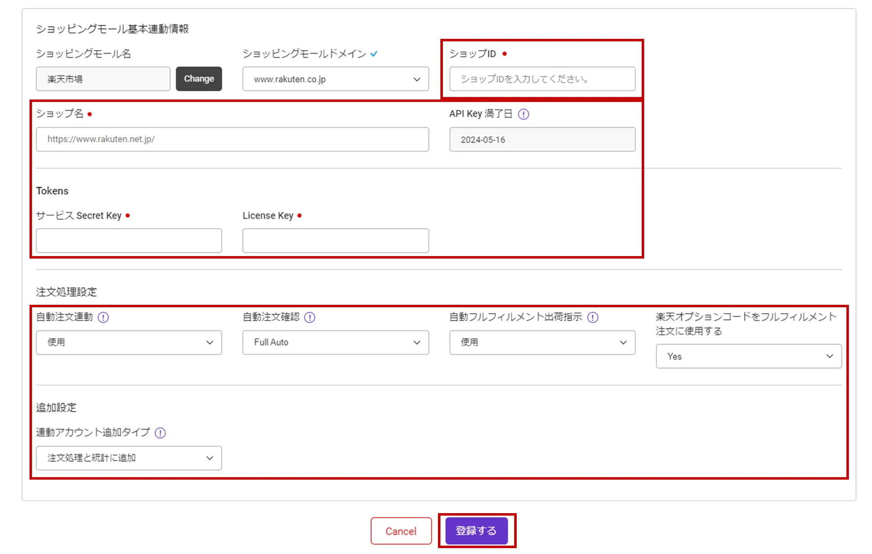 Rakuten サービスへのAPI接続設定には、次の情報が必要です。