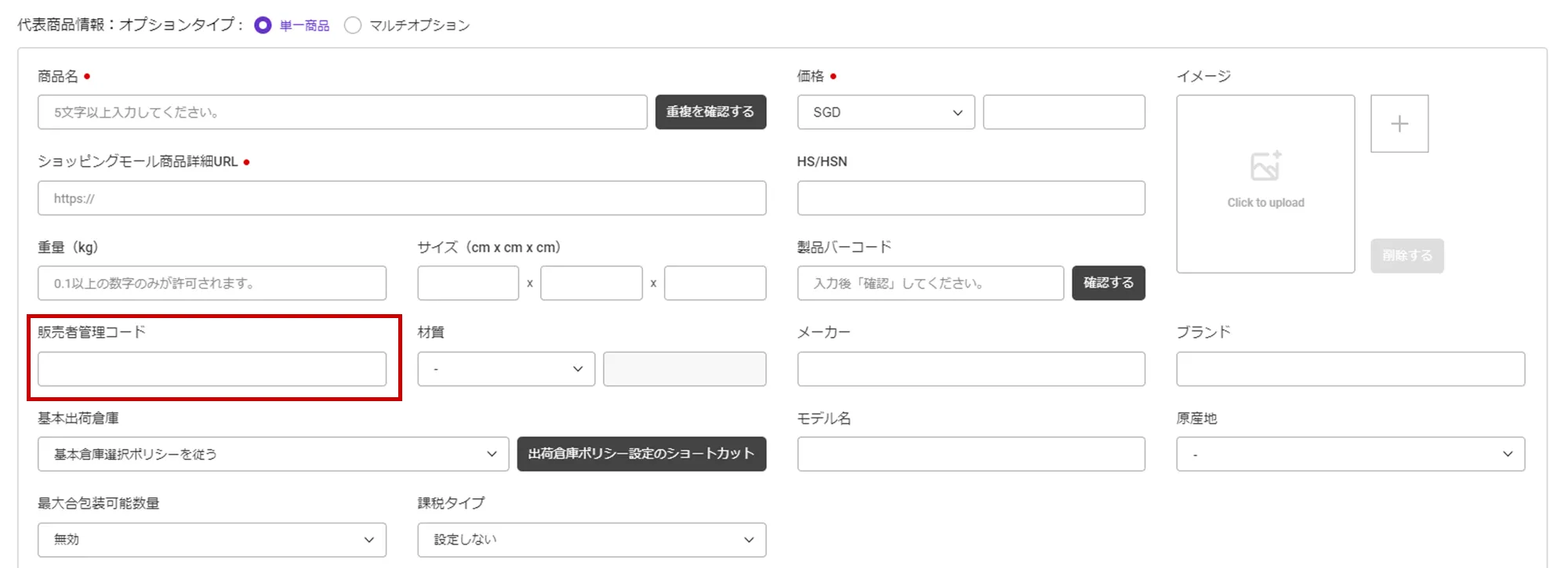 単一商品タイプのSKUを登録し、'販売者定義コード'を入力してください。