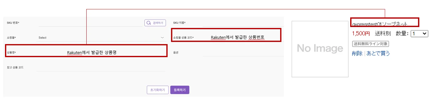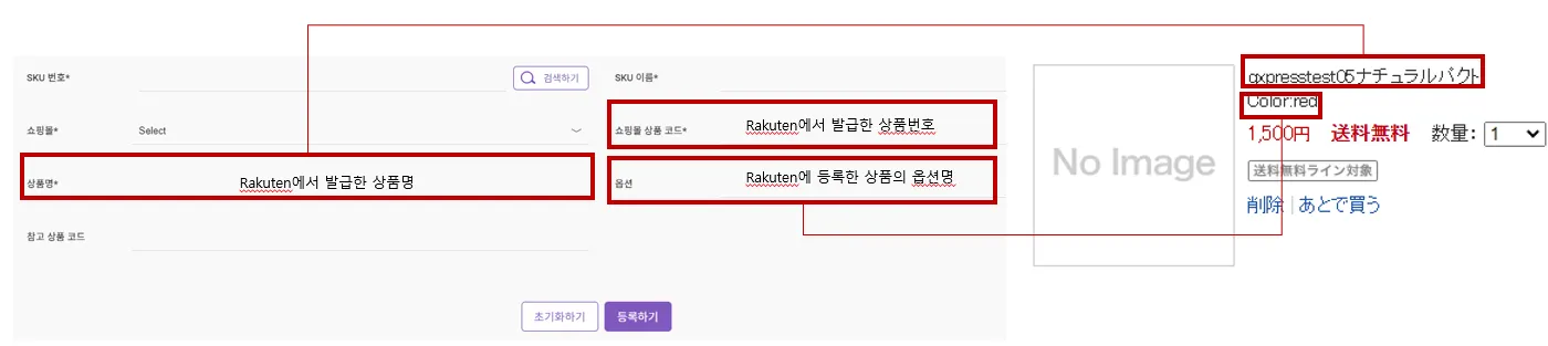 スマートシップで以下のようにRakutenの商品名とスマートシップのSKUを接続することができます。 この時に入力する商品名/オプション値は、分かち書き、大文字、小文字をはじめテキストを同一に入力してください。