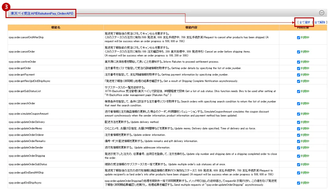 楽天ペイ受注API(RakutenPay_OrderAPI) 項目の [全て選択] ボタンを押して、すべて選択して登録してください。