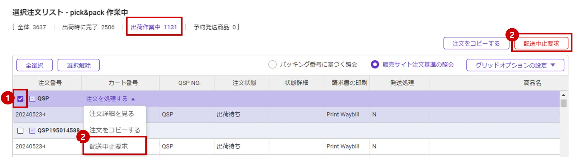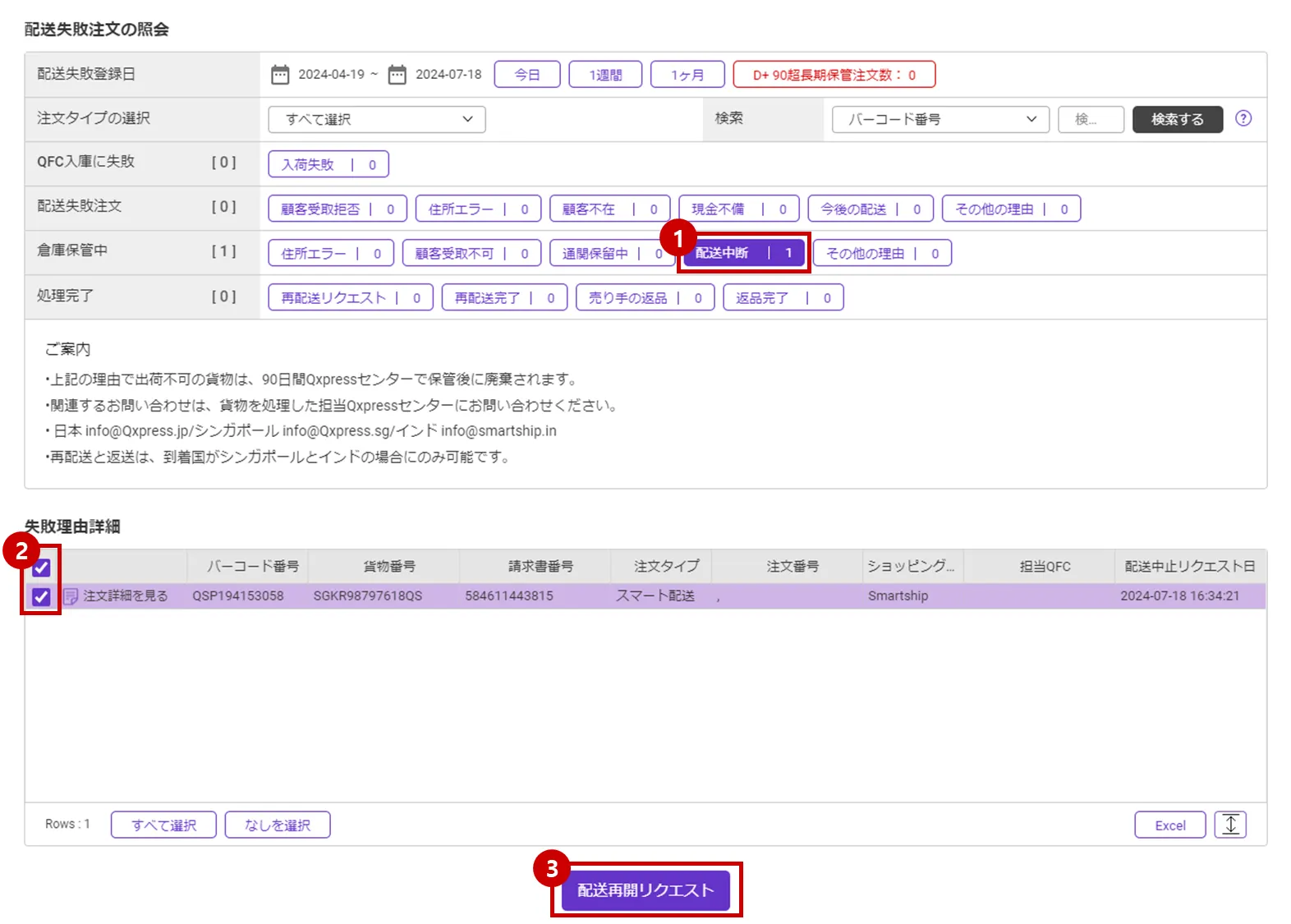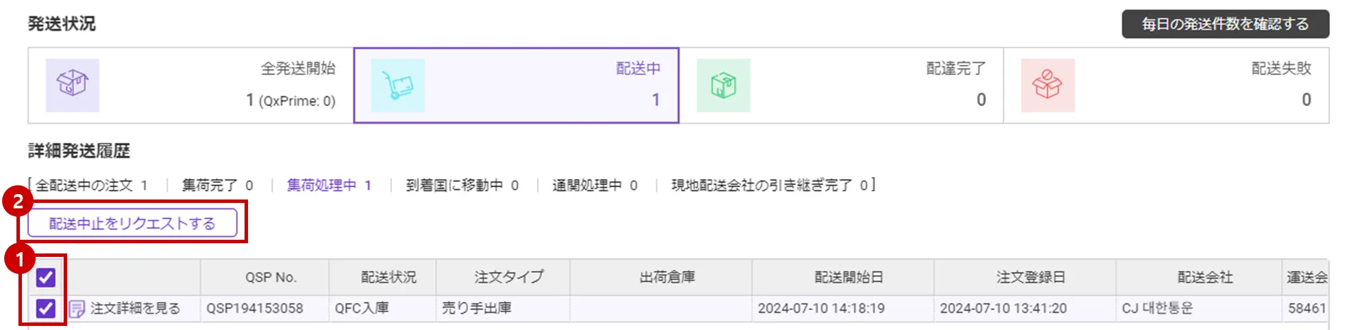 Qxpress Fulfillment Center (QFC)注文 : 注文管理メニューから「出荷作業中」、「梱包完了」状態の注文、配送状況メニューから「集荷処理中」状態の注文に限り、配送中断を要請することができます。
