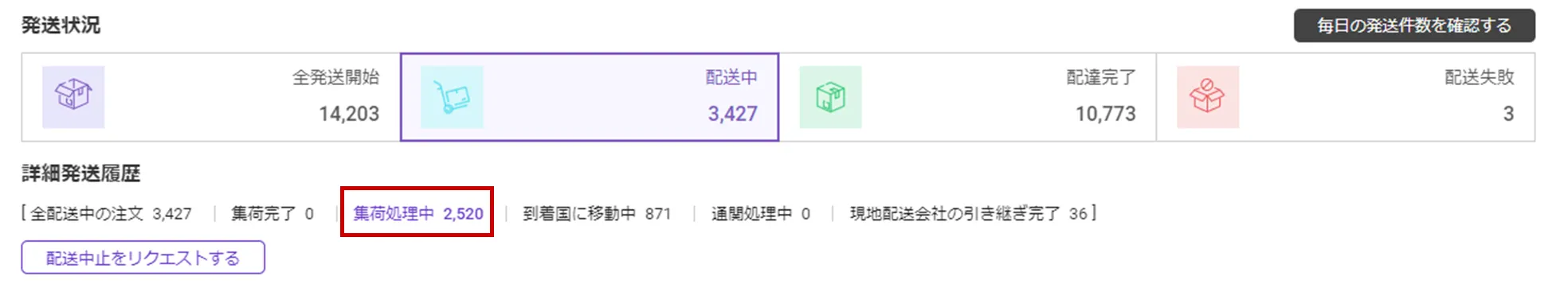売り手出庫 : 配送状況メニューで「集荷処理中」の注文に限り、配送中断を要請することができます。
