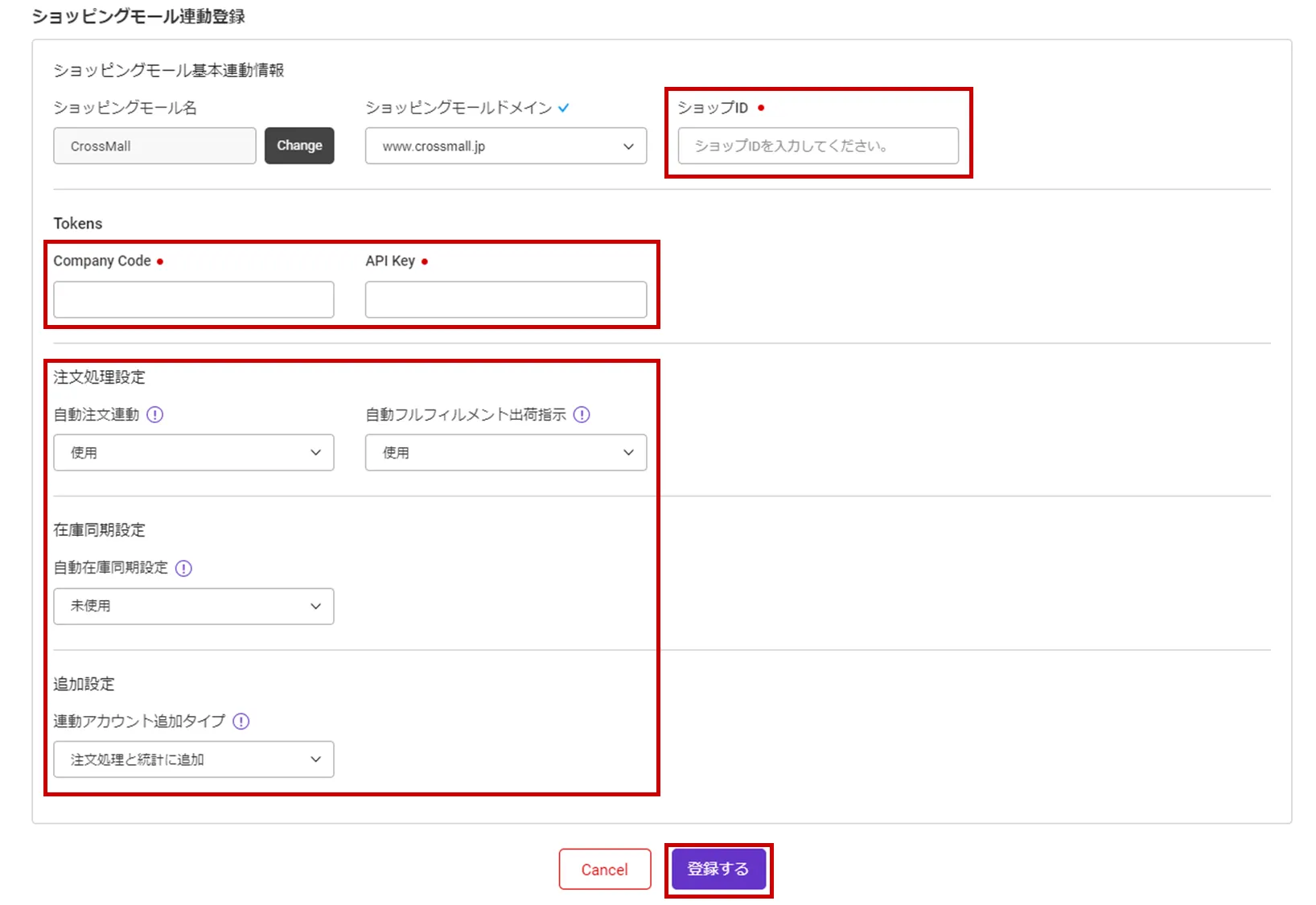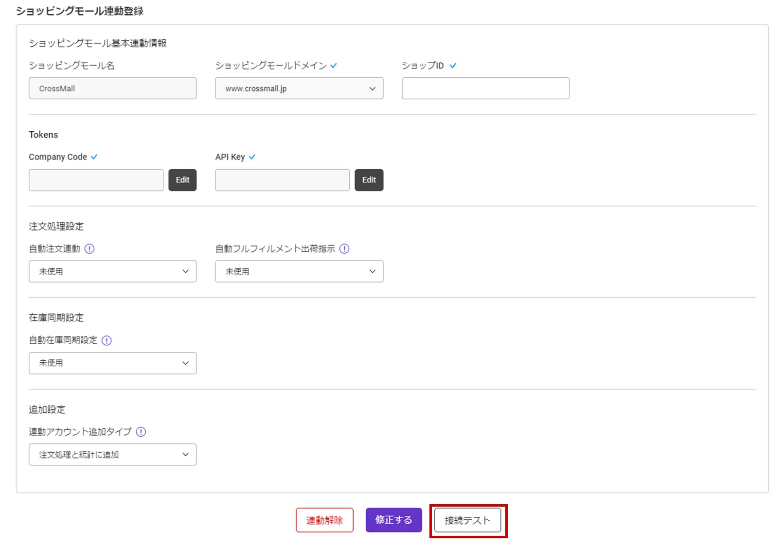 Crossmall サービスへのAPI接続設定には、次の情報が必要です。
