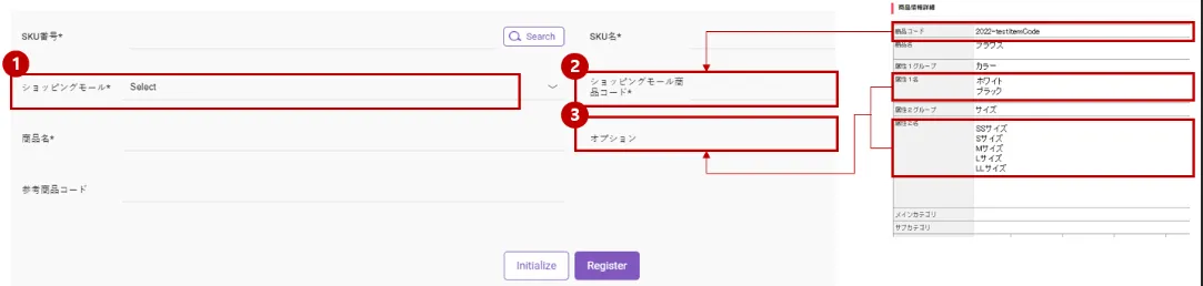 この時に入力する商品名/オプション値は、分かち書き、大文字、小文字をはじめとするテキストを同一に入力してください。