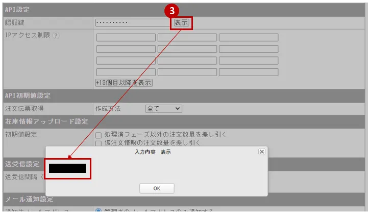 ページ下部のAPI設定の[表示]ボタンを押すとAPIKEYが確認できます。