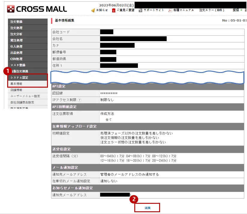 Crossmall にログインした後 , システム設定 > 基本情報 > 基本情報 メニューに入ります。