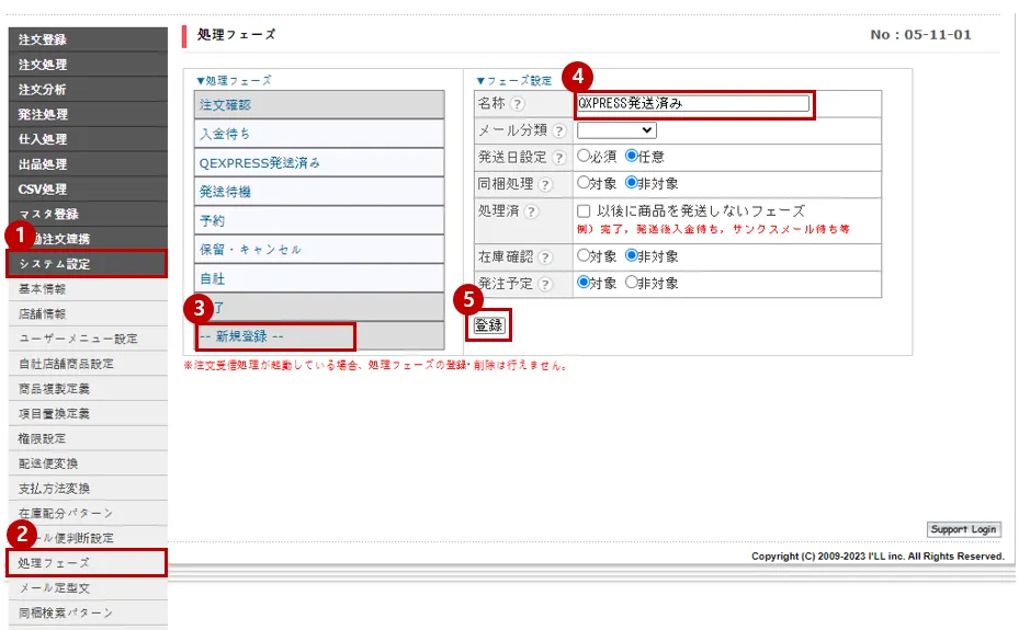 システム設定 > 処理フェーズ メニューから ”QXPRESS発送済み” のフェーズを新たに追加してください。別の名称の値でフェーズが作成されますと、配送状態のアップデートはできませんので、ご参考ください。