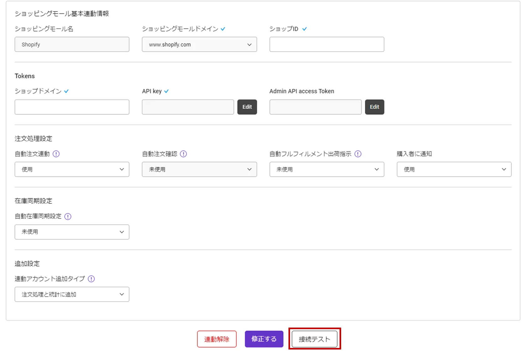 Shopify サービスへのAPI接続設定には、次の情報が必要です。