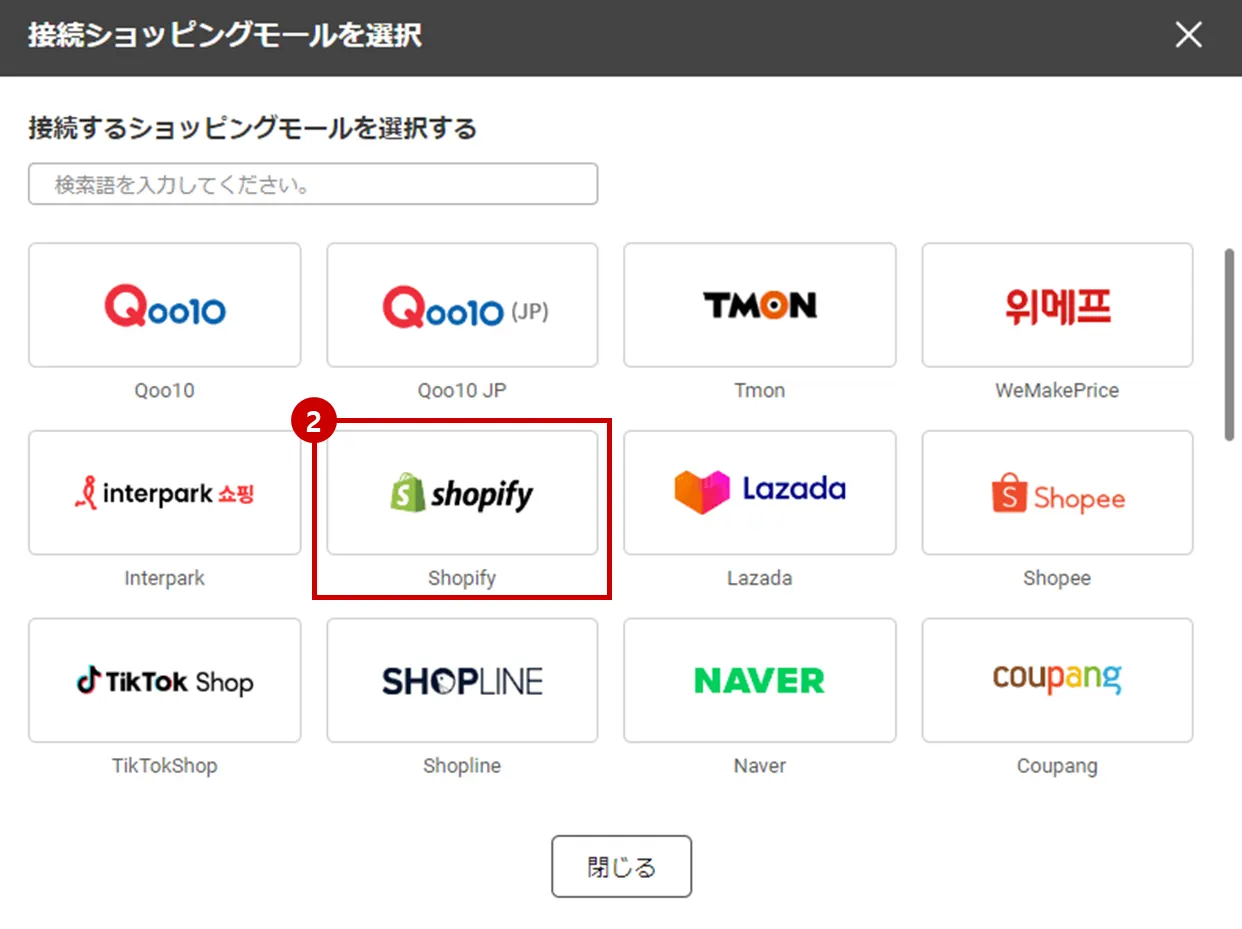 “Shopify”を選択した後、下段の"ショッピングモール連動登録"へスクロールを移動してください。
