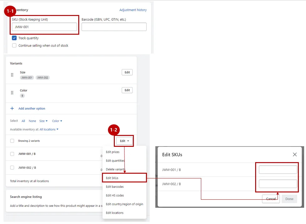 在庫同期およびフルフィルメントサービスをご利用の場合は、 Shopify 販売商品にスマートシップSKUを接続してください。