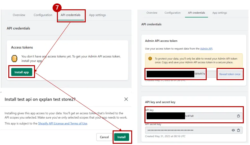 API credentials メニューで [Instalapp]ボタンを押すと表示される通知ウィンドウが表示されます。 この通知ウィンドウで[Install]ボタンを押すと、APIKEYとADMIN API Access Tokenが発行されます。"Reveal token once"を押すと出てくるTokenは一度だけ公開されますので、Tokenをコピーして保存してください。