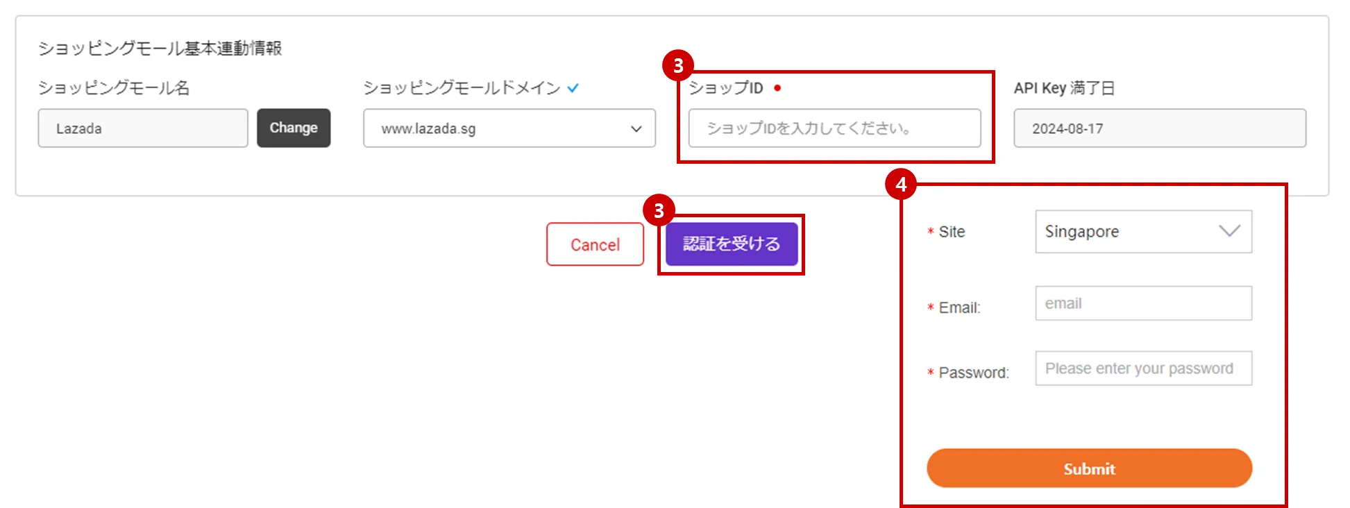 Lazada サービスへのAPI接続設定には、次の情報が必要です。