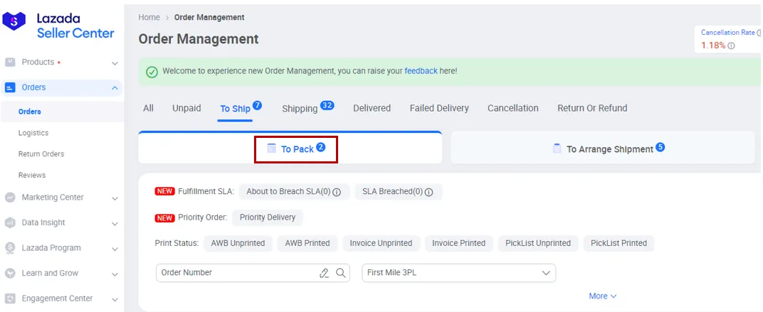 Lazada で発生した新規注文のうち、 “To Pack” (To Shipの前のステータス) 状態の注文を取得します。