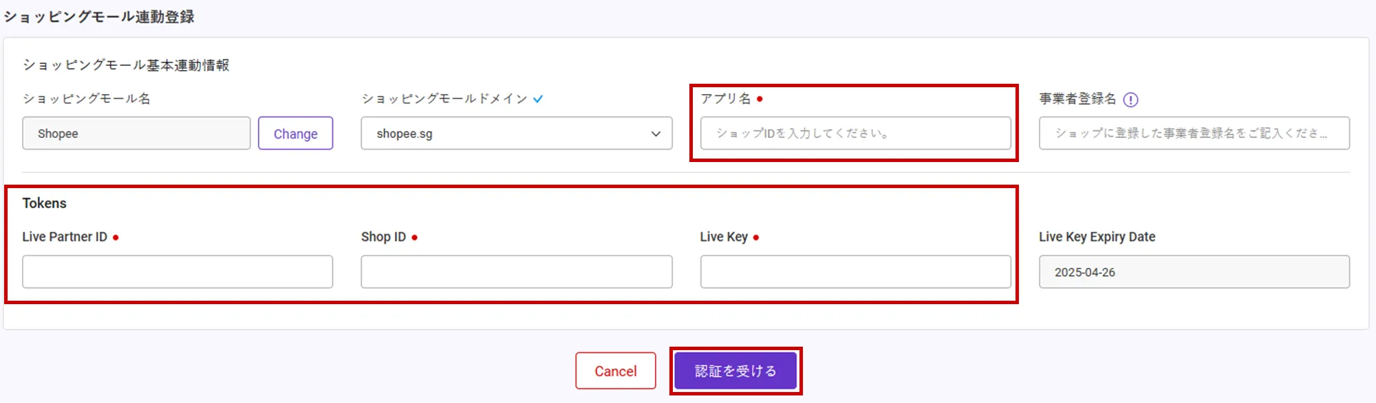 Live Key: 1. Shopee でAPI KEYの発行を受ける。の手順で 発行された Live Key を入力します。