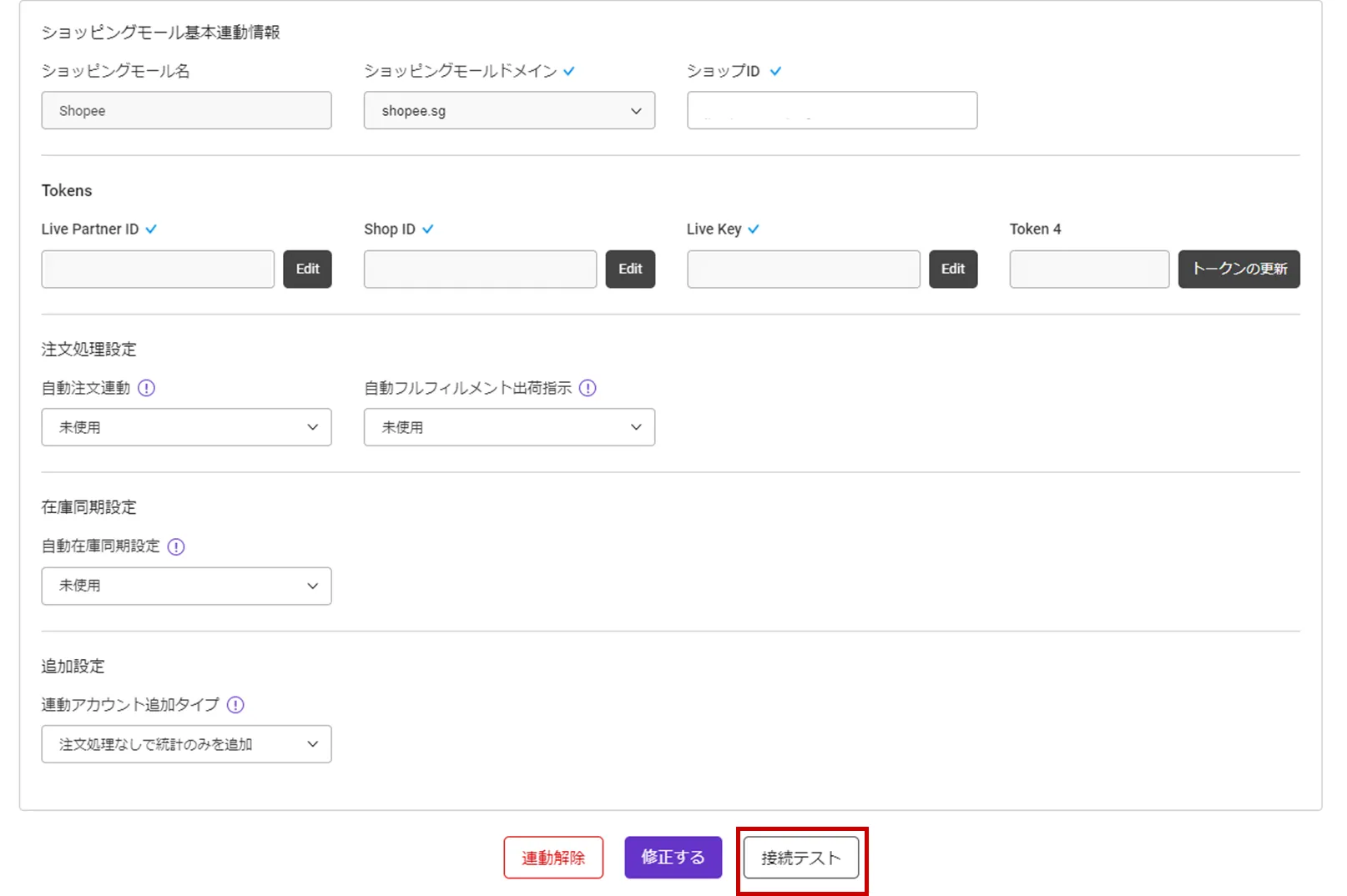 Shopee サービスへのAPI接続設定には、次の情報が必要です。