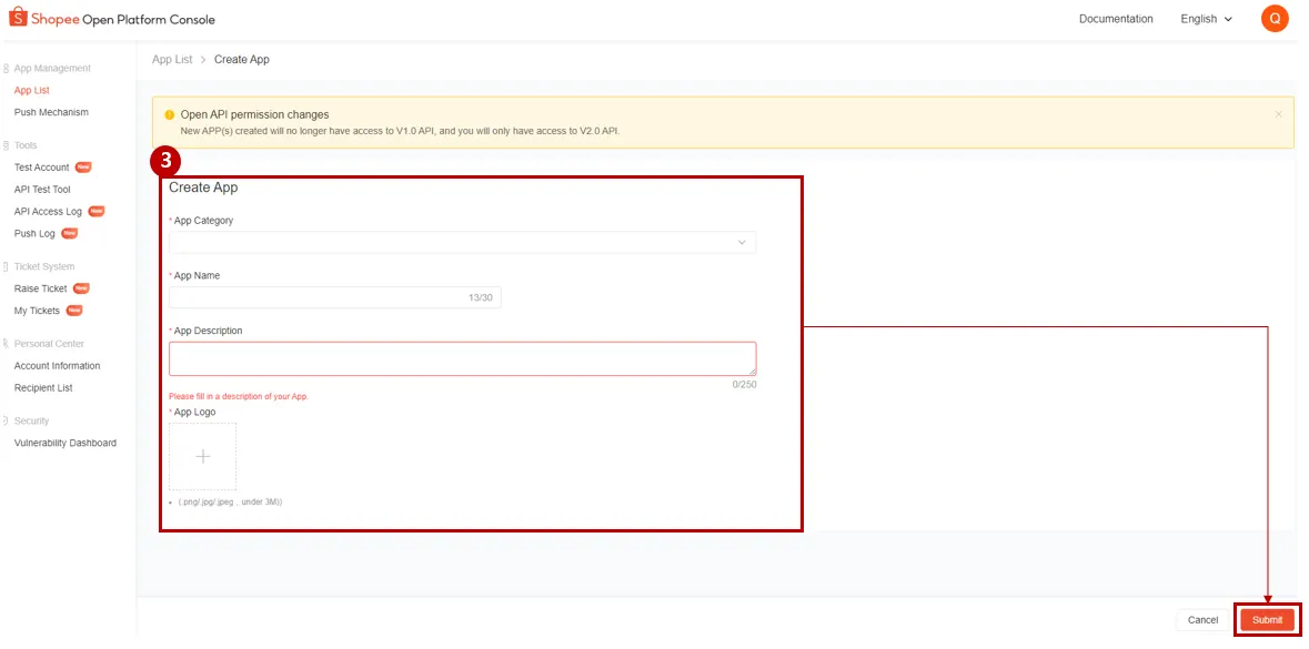 Shopee サービスでは、次の手順に従ってAPIキーを照会/発行することができます。