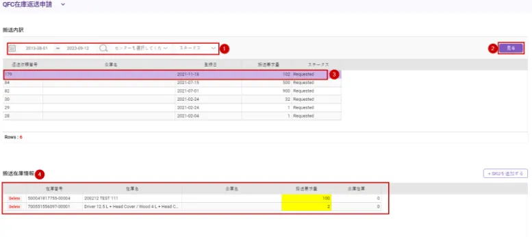 返送申請日の設定 > 返送申請 QFC 選択 > 返送申請状況を選択してください。