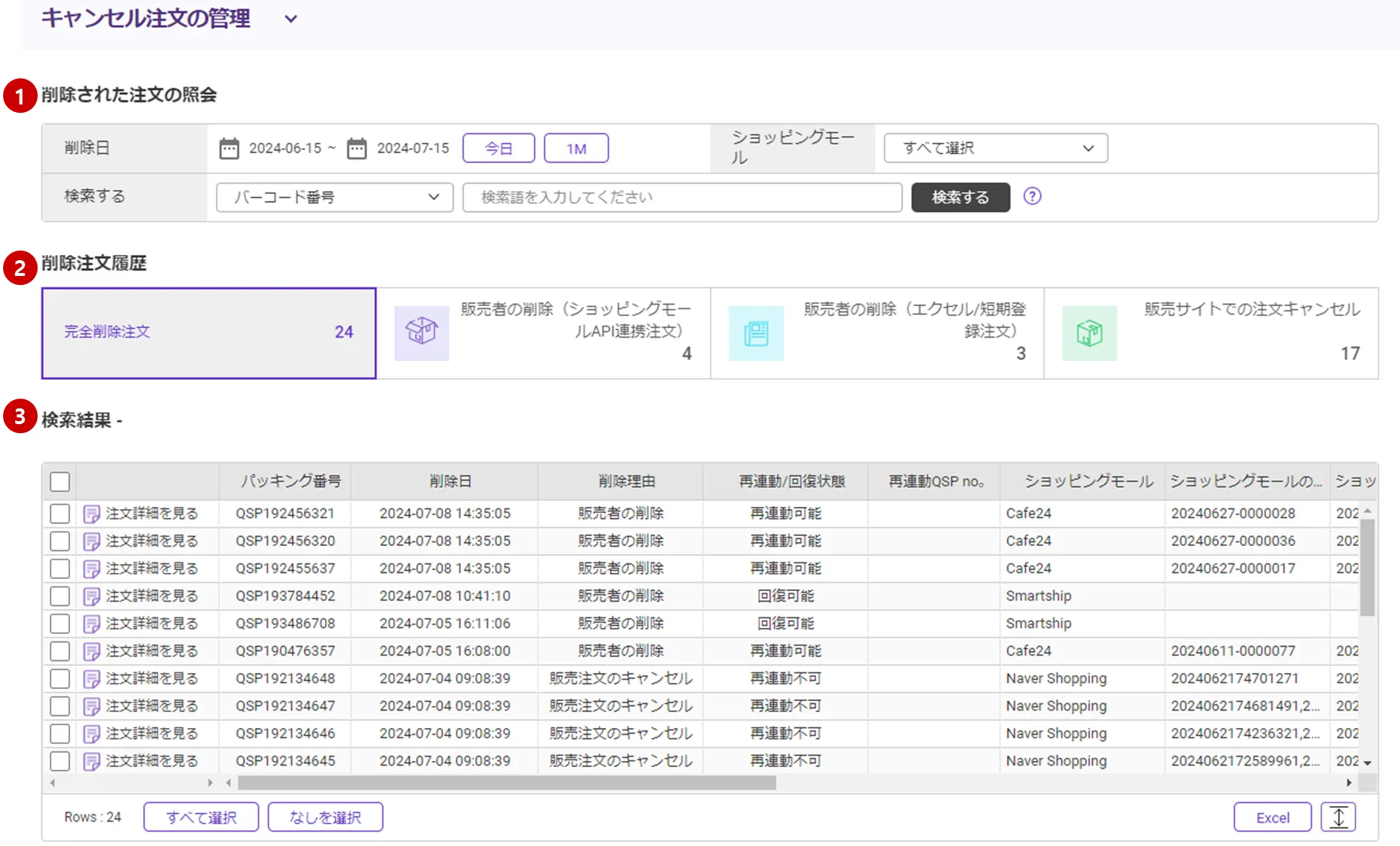販売者の削除 (エクセル/個別登録) : Excelや個別注文登録を通じて直接登録した場合です。この場合、重複した注文が確認されない場合は、復旧することができます。