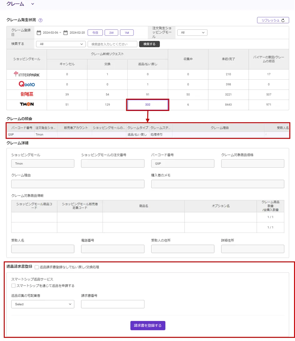 クレーム詳細をご確認の上、返品回収のための請求書を登録してください。