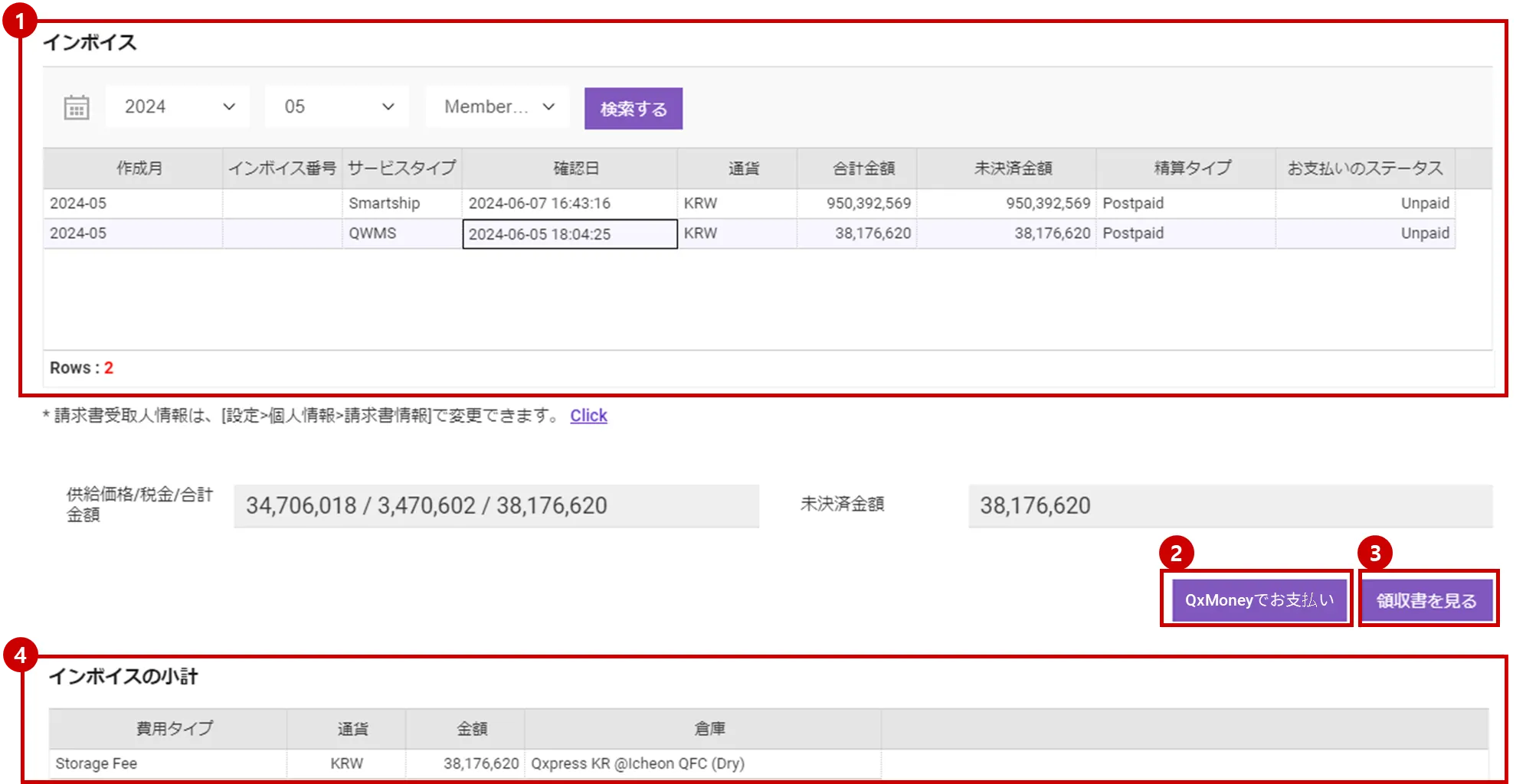 インボイス検索項目で決済タイプが Prepaid 状態で、支払ステータスが Unpaid の場合のみ [QxMoneyでお支払い]ボタンが表示されます。[QxMoney] ボタンをクリックすると、未払い金額だけQxMoneyが自動的に差し引かれ、QxMoneyが足りないときチャージ要求メッセージが表示されます。