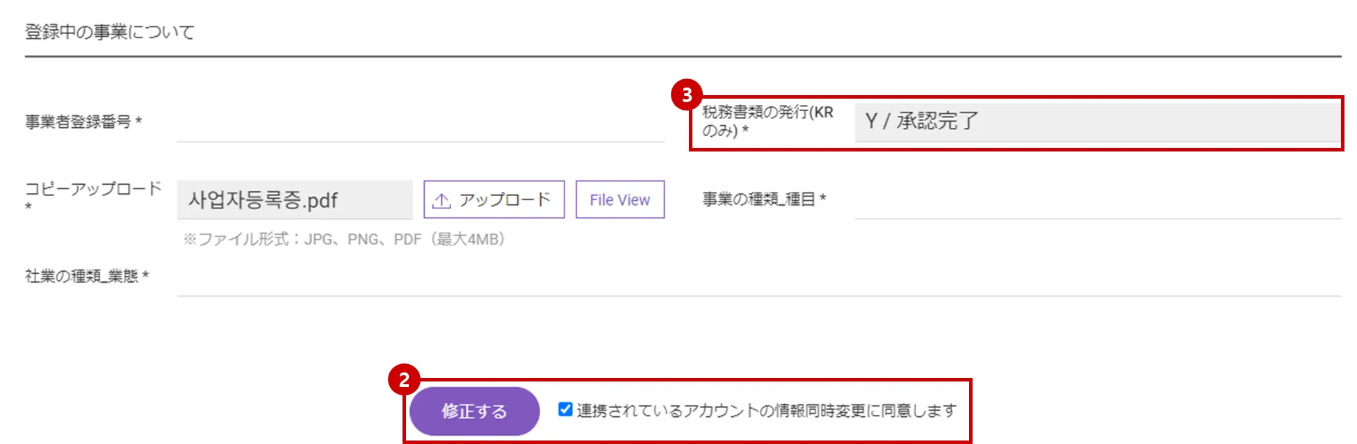 [修正する] ボタンをクリックした際、「連携されているアカウントの情報同時変更に同意します。」にチェックを入れると、連携アカウントの請求書発行情報も変更されます。