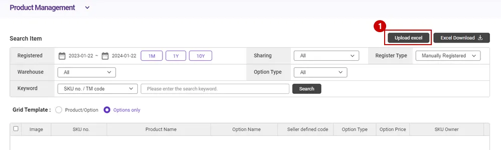 Please click the [Select File] button to register the Excel file and, click the [Excel Upload] button to complete product registration.