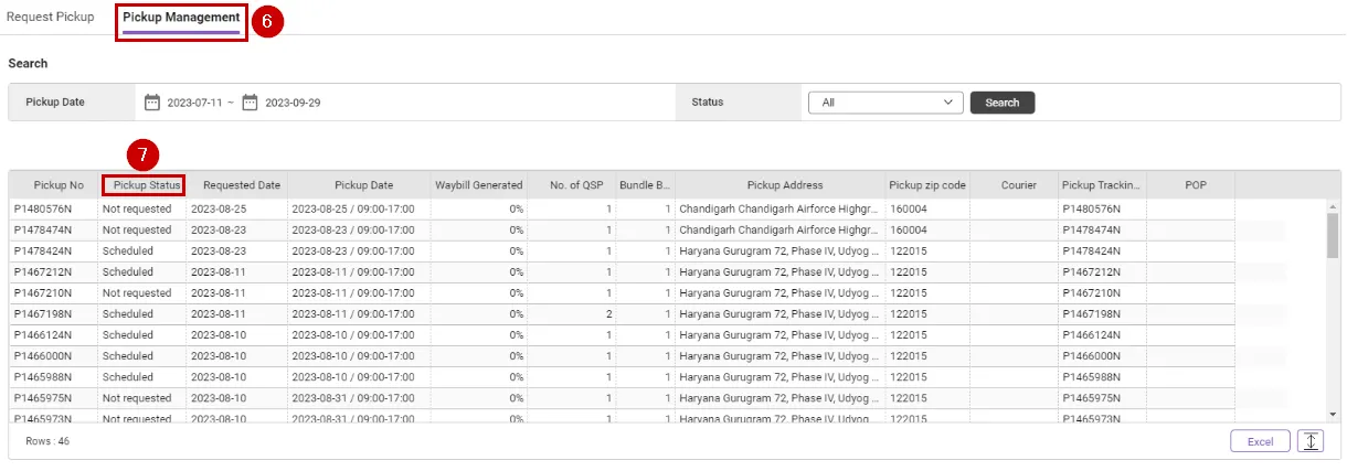 Click the Pickup > Pickup Management tab to check the requested pickup details.