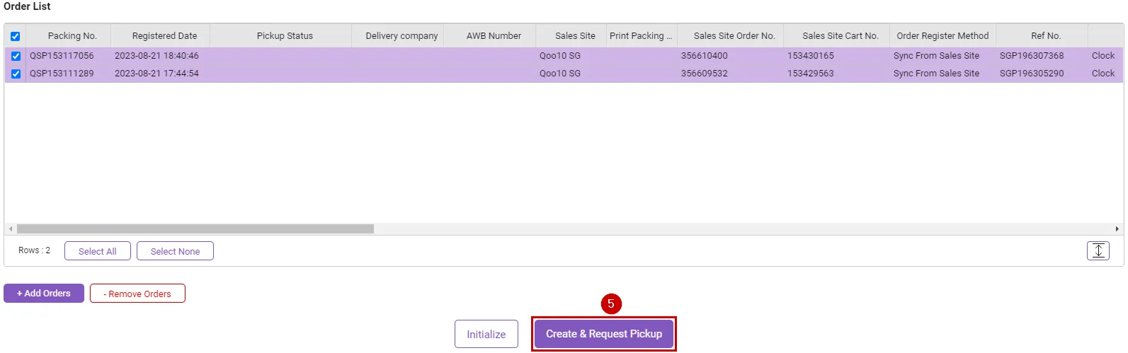 After selecting an order, click the [Select Orders] button. The window will then close and the pickup will include the order you selected.