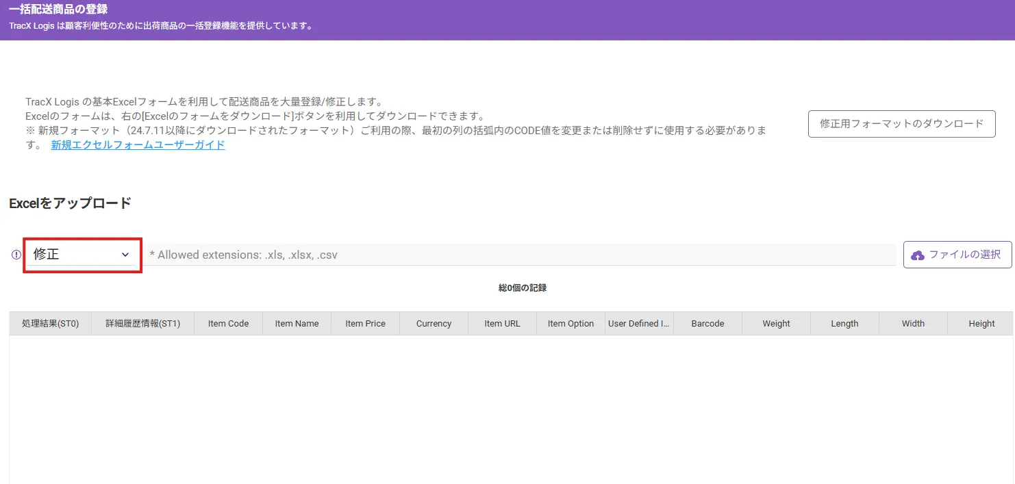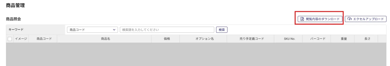 修正対象件 エクセル ダウンロード : 既存登録商品の中から修正が必要なアイテムコードを検索 → [ 閲覧内容のダウンロード ] クリック