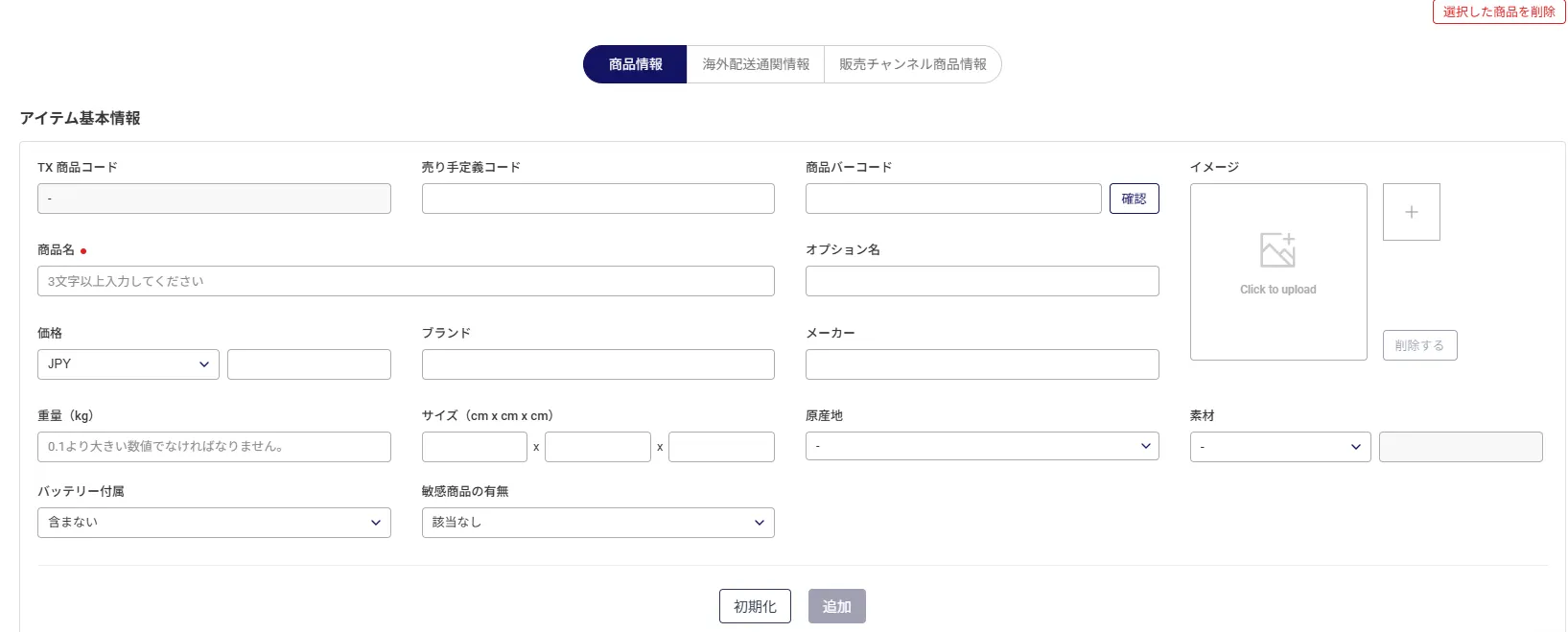 商品情報 : 基本的な商品情報の内容をご記入の上、[追加]