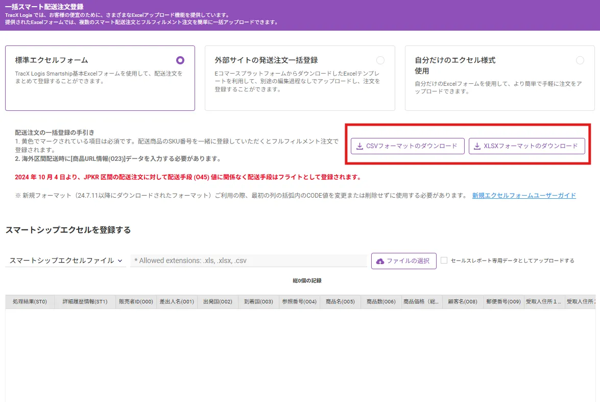 Excelをアップロード : 上位メニューから [Excelをアップロードする] にアクセスし、[XLSXフォーマットをダウンロード] をクリックすると、様式をダウンロードすることができます。