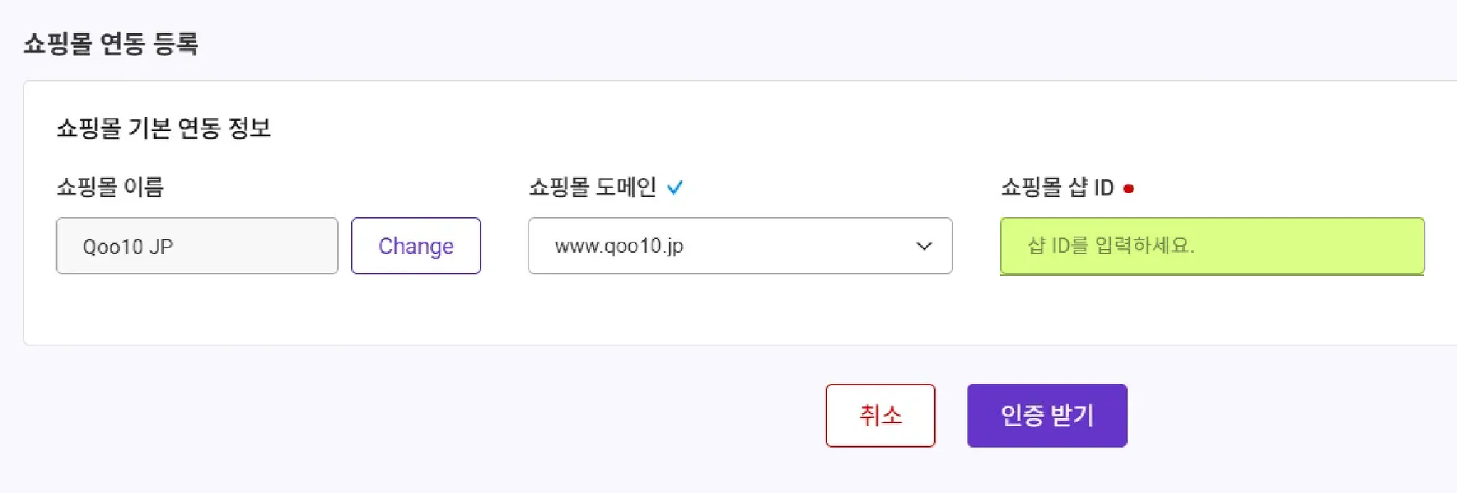 ‘쇼핑몰 샵 ID’ 입력란에 "JQSM 로그인 아이디"를 입력합니다.